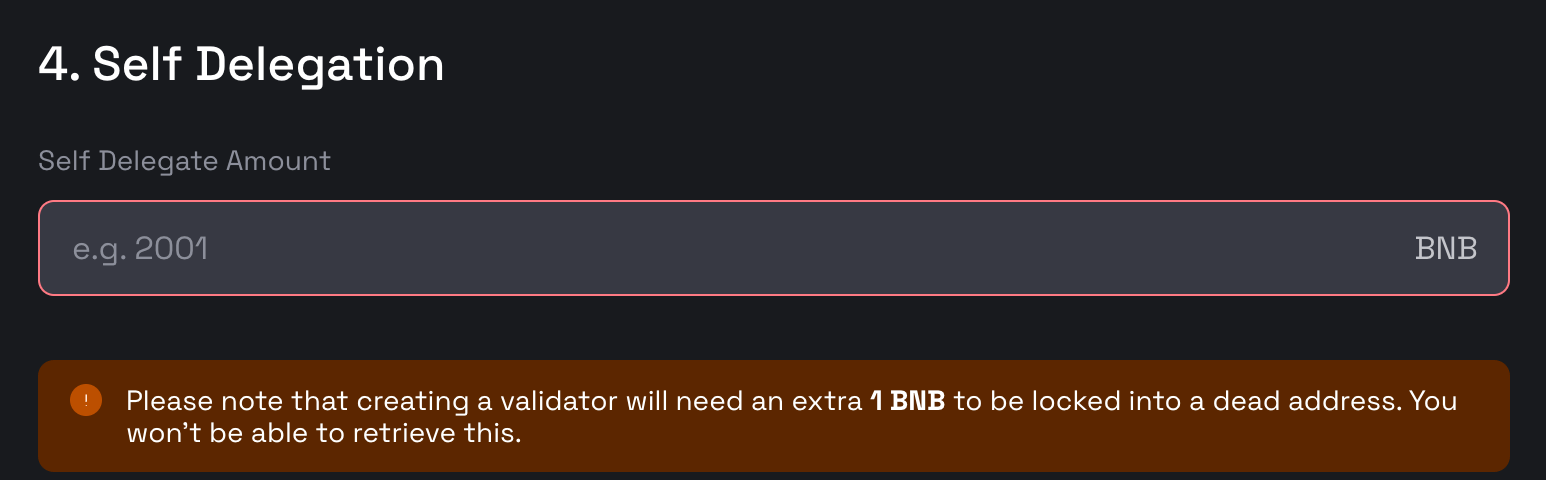 * **Self Delegate Amount**: The amnout to delegate when creating the validator. The minimal number to input is `2001` - for the minimal self delegation amount is 2000 BNB and extra 1 BNB for locking to a dead address.